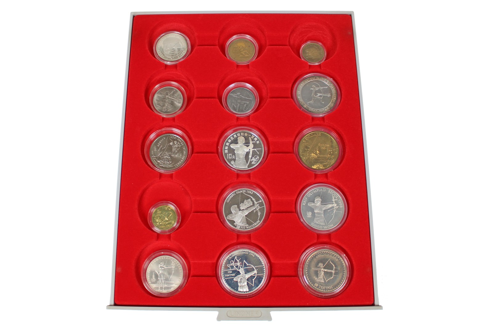 Lindnertableau met 15 munten, waarvan 7 in zilver, diverse landen, allen met thema; “boogschutter”.O.a. China, Monaco enz.