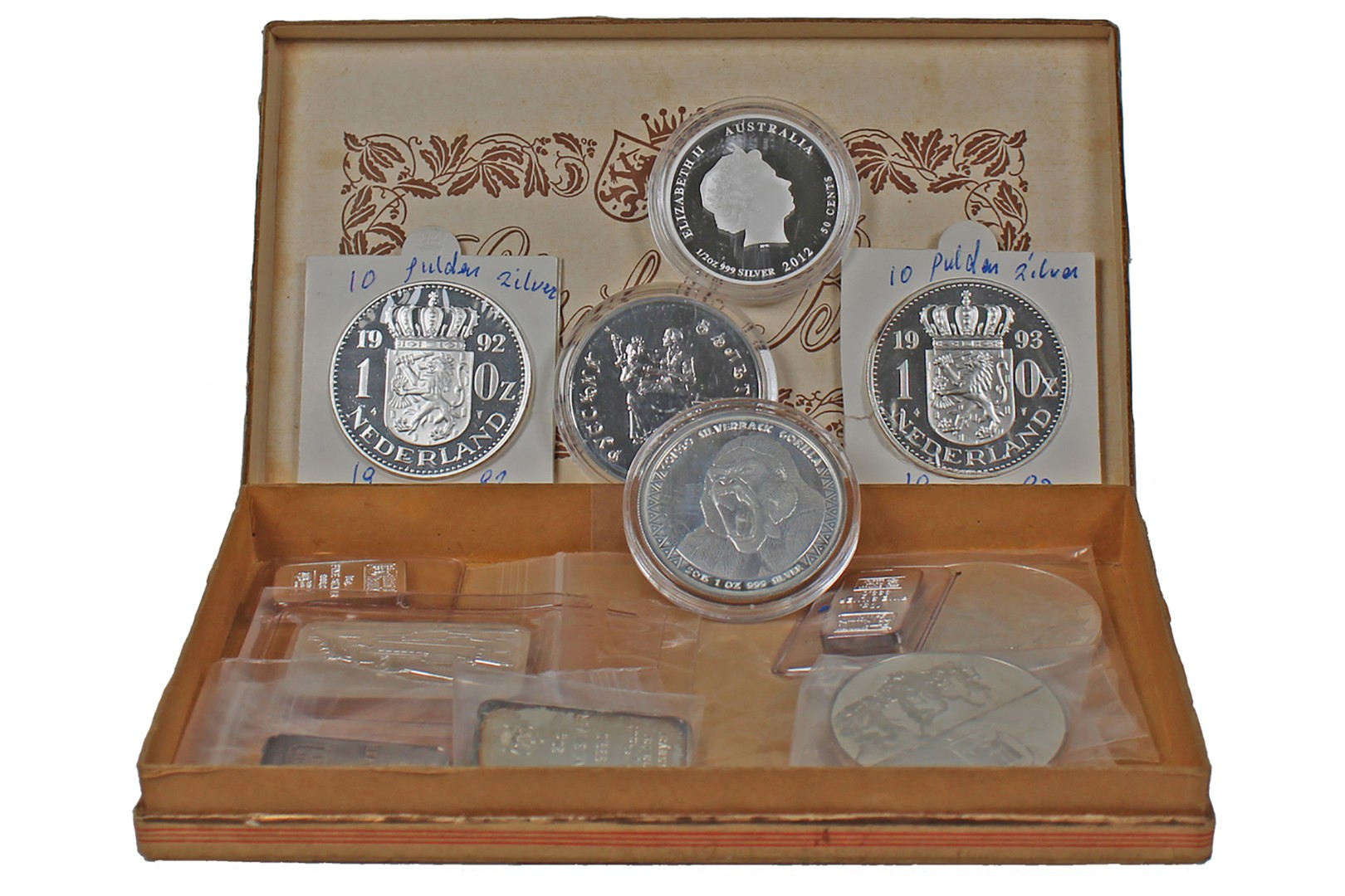 Sigarendoosje ‘Elisabeth Bas’ met 999/1000 zilver; enkele penningen, troy ounces en zilverbaartjes. Netto zilver: 292 gram.