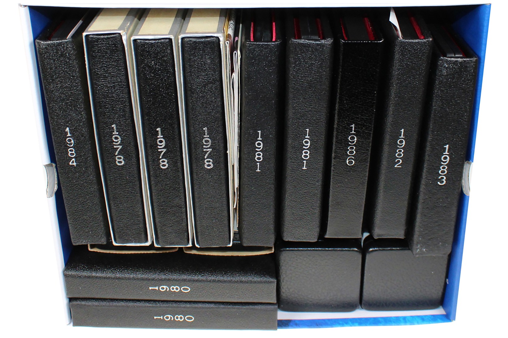 Doos Canada: prestigesets 1978-1984 (11) en zilv. Herdenkingsdollars (11). Alles in orig. verp.