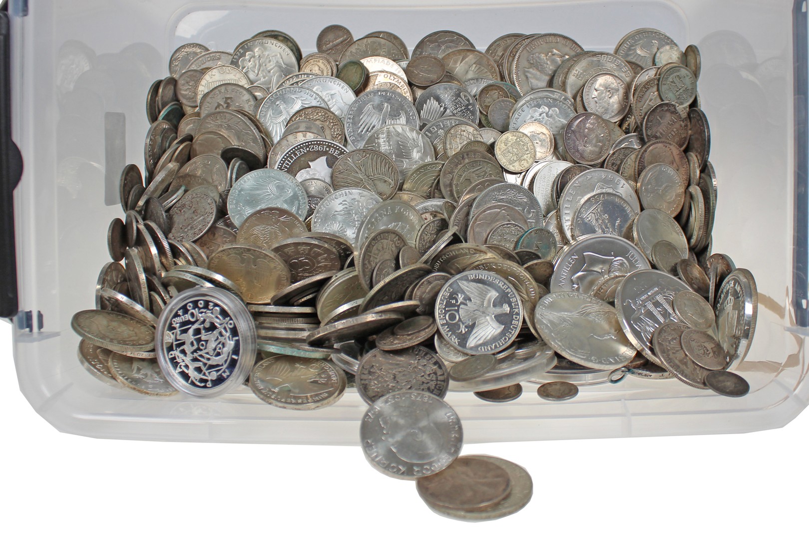 Plastic bak met ruim 7,5 kg. (bruto) zilveren wereldmunten diverse eeuwen. Mooi uitzoekwerk voor lange winteravonden!