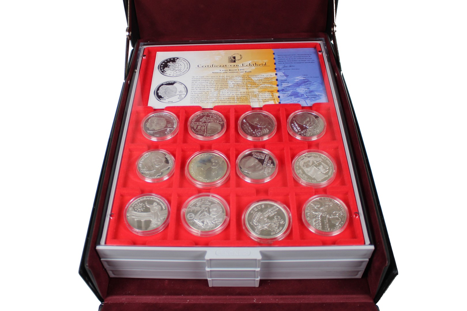 Zwart koffertje met 3 Lindnertableaux met 36 zilveren euro’s of voorlopers op de euro, diverse landen. Netto zilver: 822 gram.