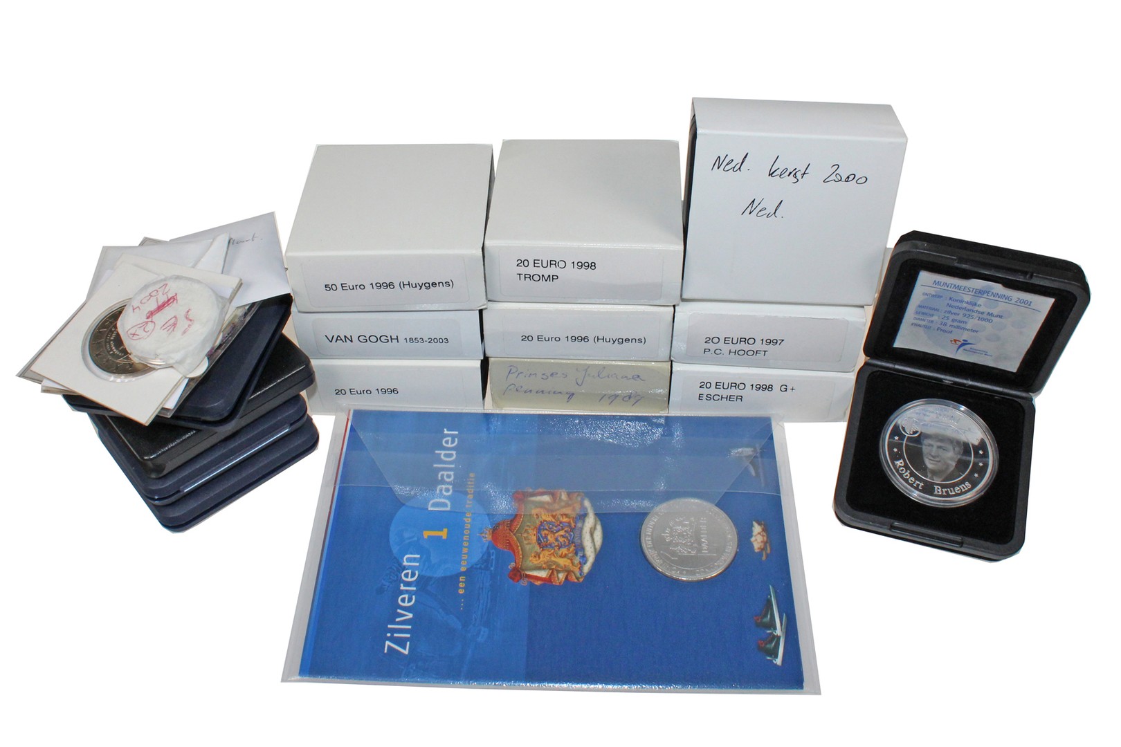 Lot met ruim 20 stuks penningen voornamelijk voorlopers van de euro, zoals 20 euro Esscher, Huygens, Tromp en P.C. Hooft. Veel zilver!