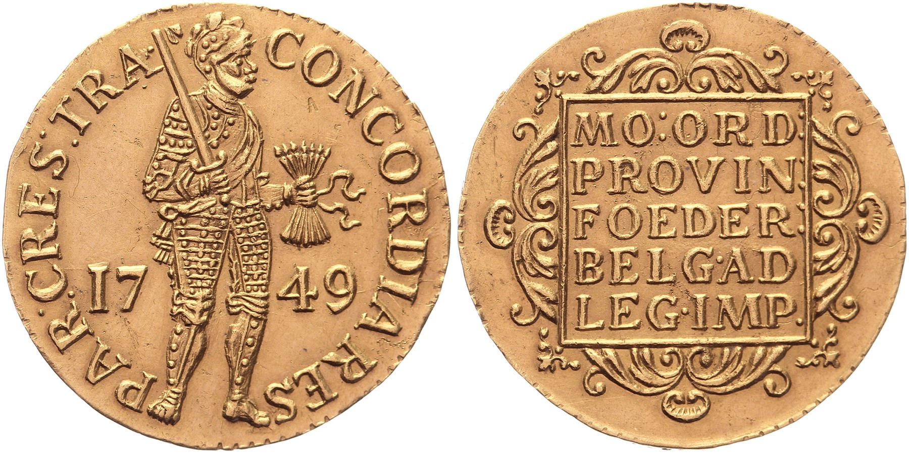 Dukaat 1749. Delm. 965; CNM 2.43.46; HPM 27. [3,52 gram]. Mogelijk contemporaine vervalsing. Prachtig.