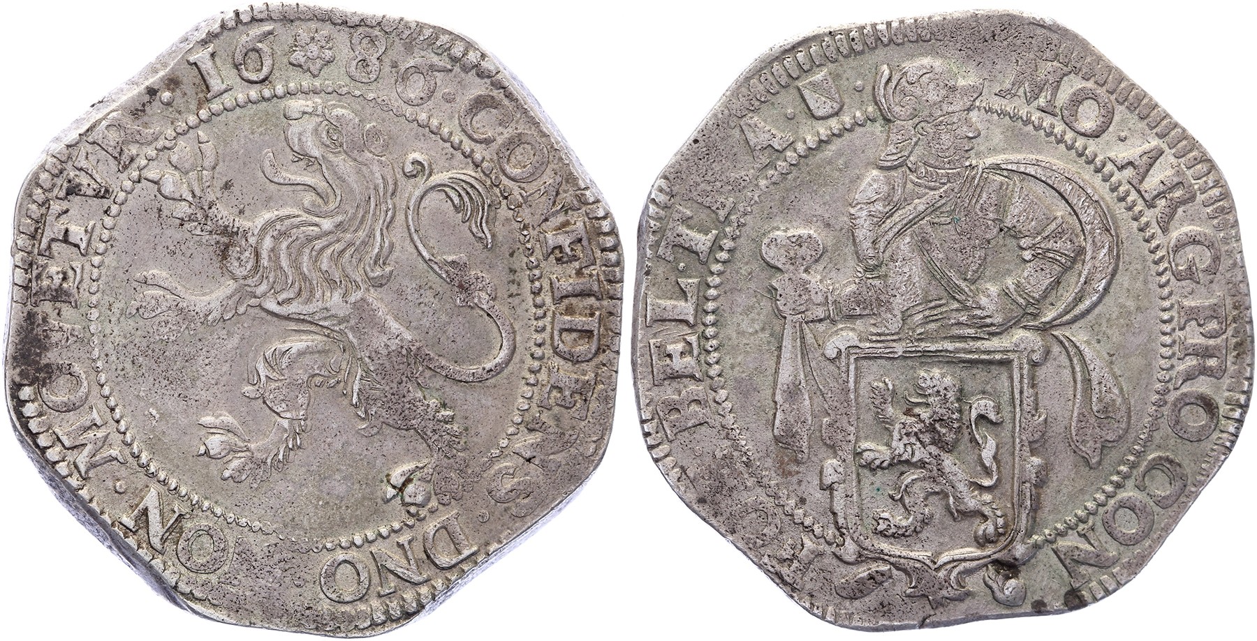 Leeuwendaalder 1686. Delm. 848; CNM 2.43.70; HPM 39. Geslagen op 8-hoekig muntplaatje. Leuke variant. Zeer fraai.