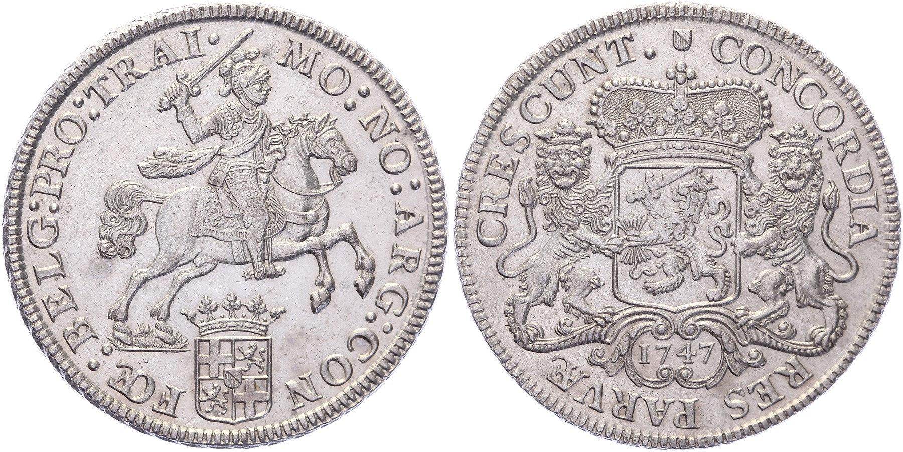 Rijder of dukaton 1747, met bloemrand. Delm. 1031; CNM 2.43.101; HPM 59. Zgn. 1e afslag mogelijk met gepolijste stempel geslagen? Zo mooi zie je ze nooit! FDC.