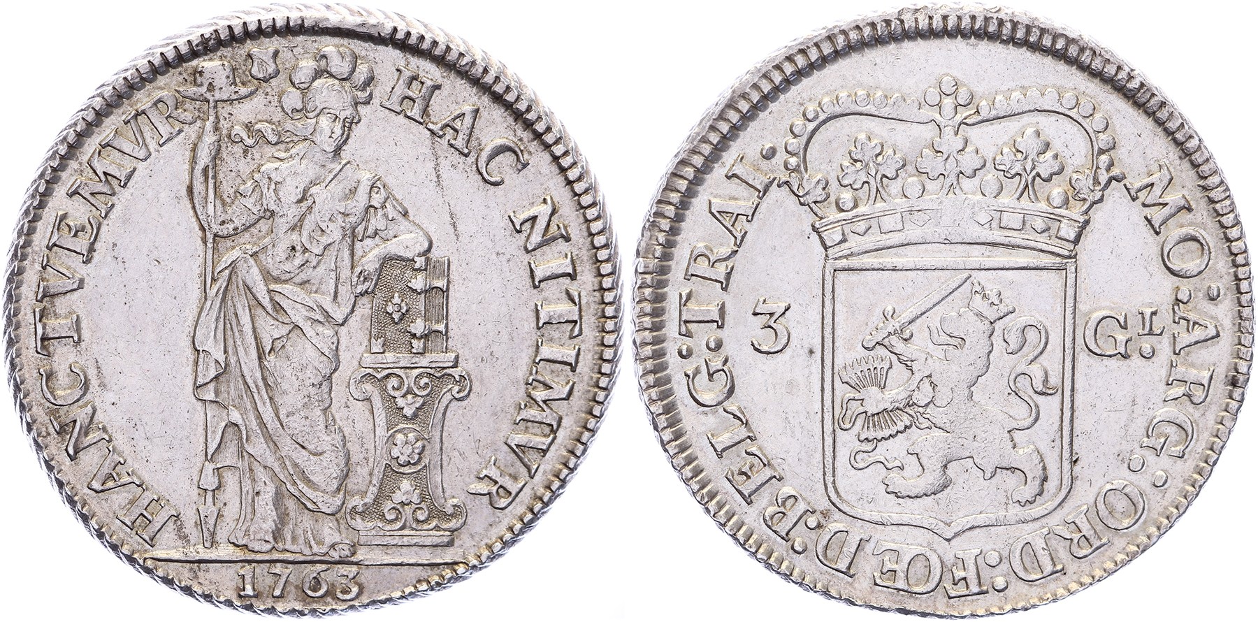 3 Gulden 1763. Delm 1150; CNM 2.43.117; HPM 71. Bijna prachtig.