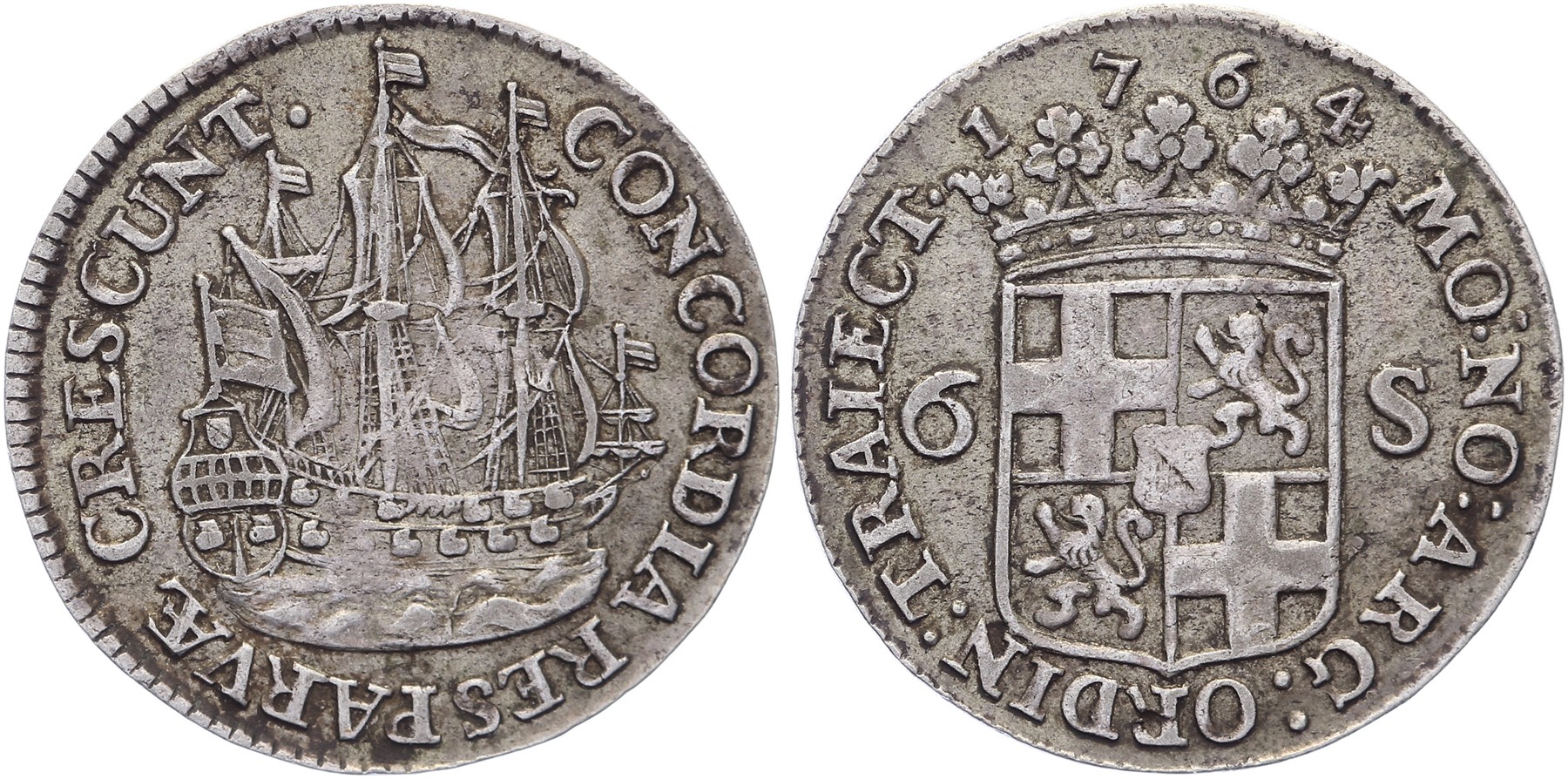 Scheepjesschelling of 6 stuiver 1764. CNM 2.43.137; HPM 84. Donkere kleur. Zeer fraai / Prachtig.