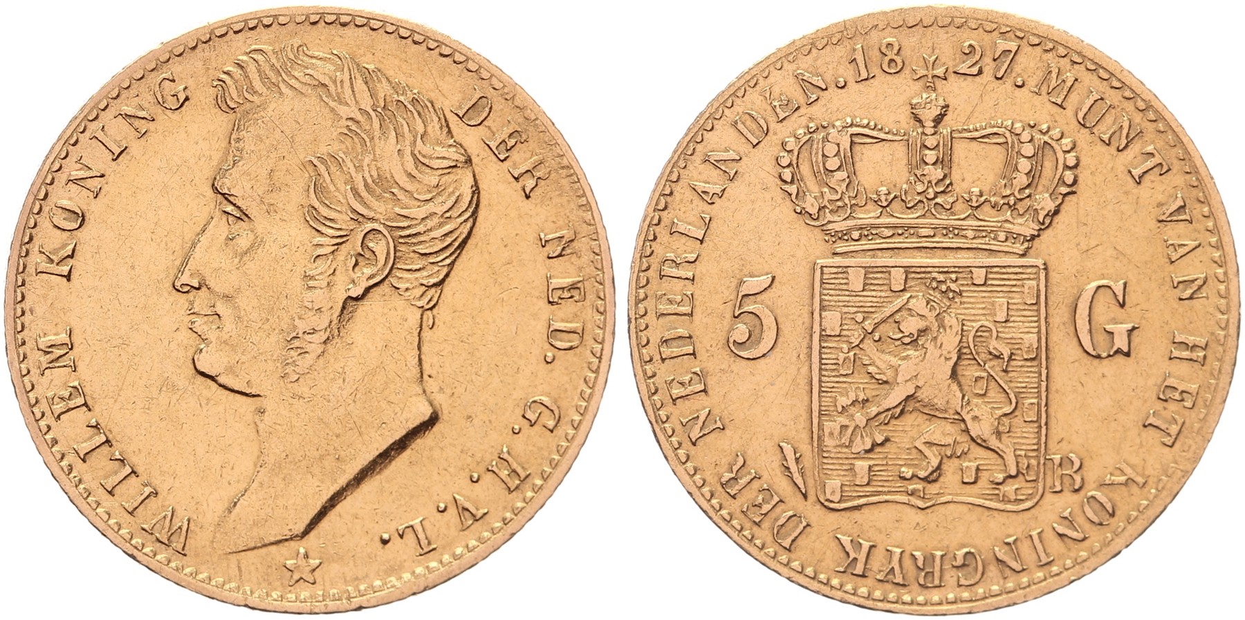 5 Gulden 1827 Brussel mmt. palmtak Sch. 198. Iets opgewreven Zeer fraai
