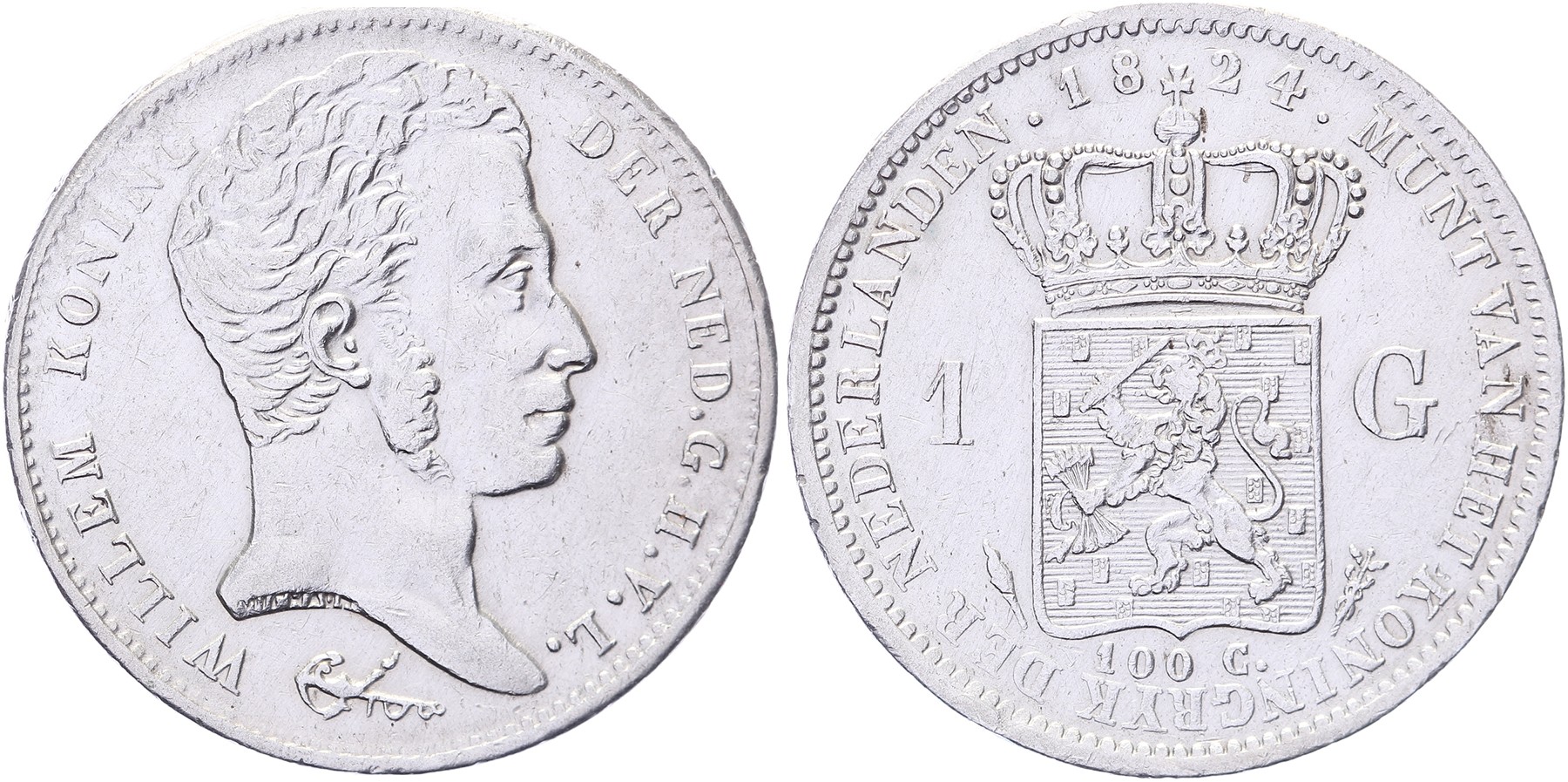 1 Gulden 1824 Utrecht mmt. fakkel Sch. 264a. Streepje tussen kroon en wapen Ruim zfr. / Bijna pr.