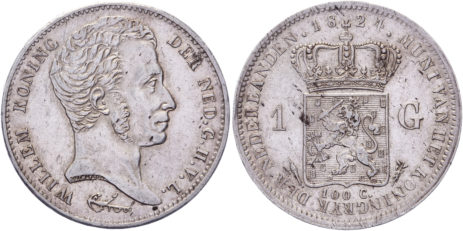 1 Gulden 1824 Utrecht mmt. fakkel Sch. 264a. Streepje tussen kroon en wapen Ruim zfr. / Bijna pr.