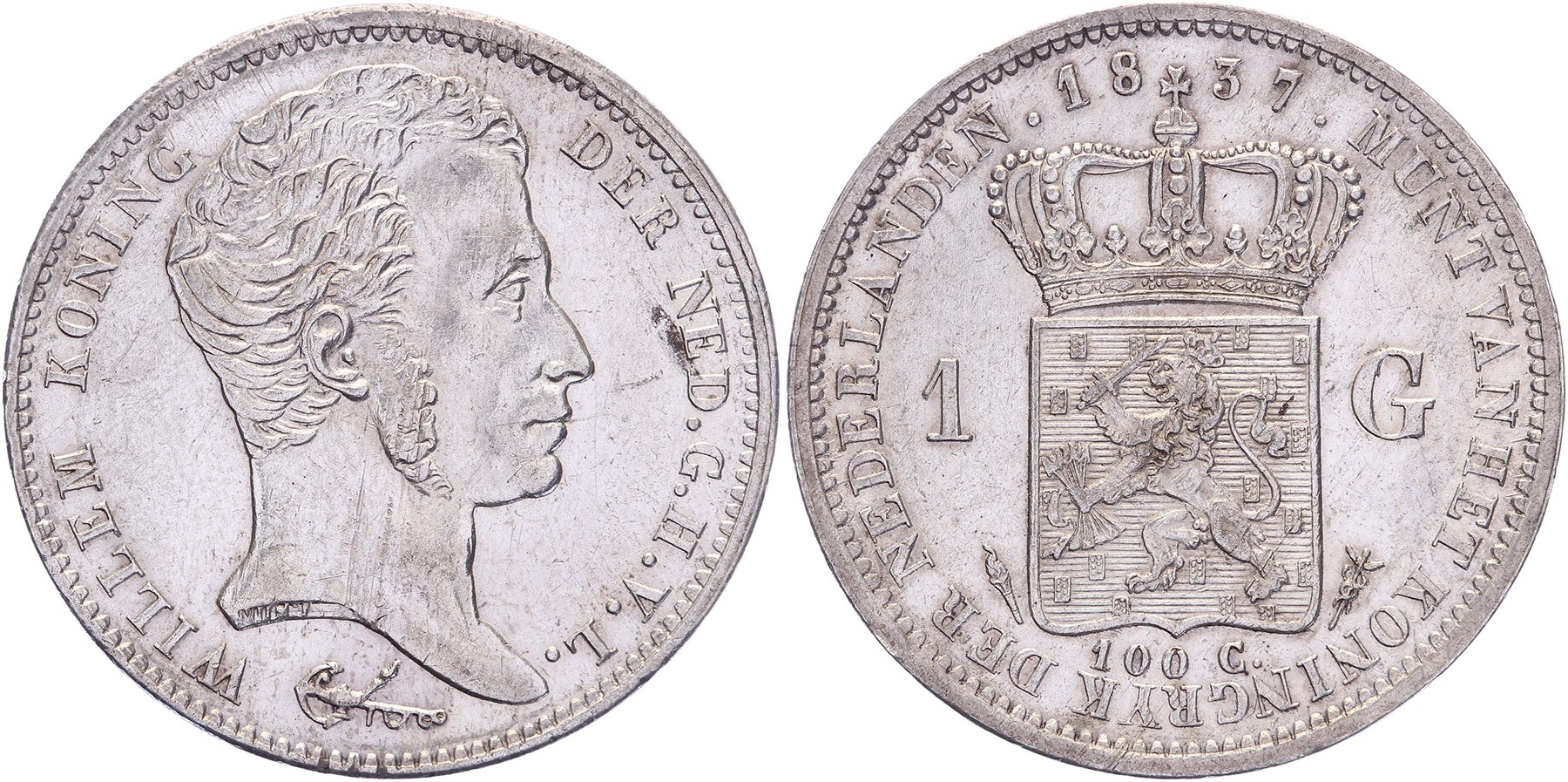 1 Gulden 1837 Utrecht mmt. fakkel Sch. 268. Justeerspoor door hals Ruim prachtig