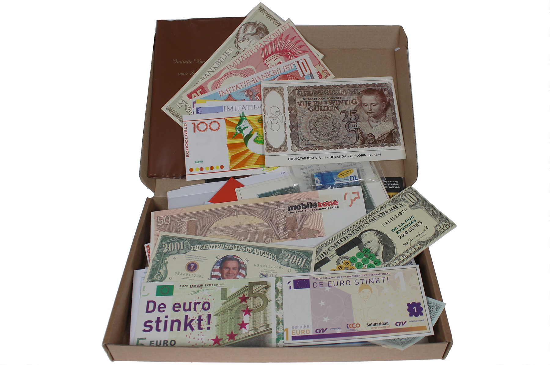 Doos met ca. 150 stuks reclamegeld, minigeld, schoolgeld, testgeld en andere rariteiten. Leuk.
