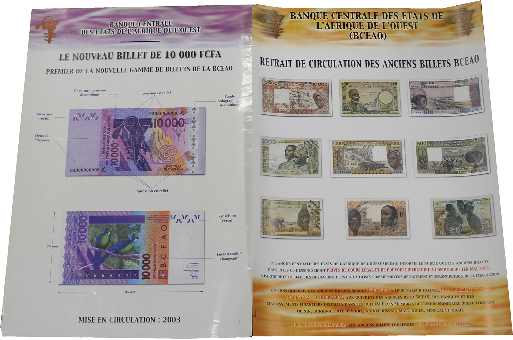 Lot (2) Posters m.b.t. Banque Centrale des etats de l’Africque de l’ouest, 2 x nieuwe biljetten afmeting 70 x 50 cm. Gebruikte staat