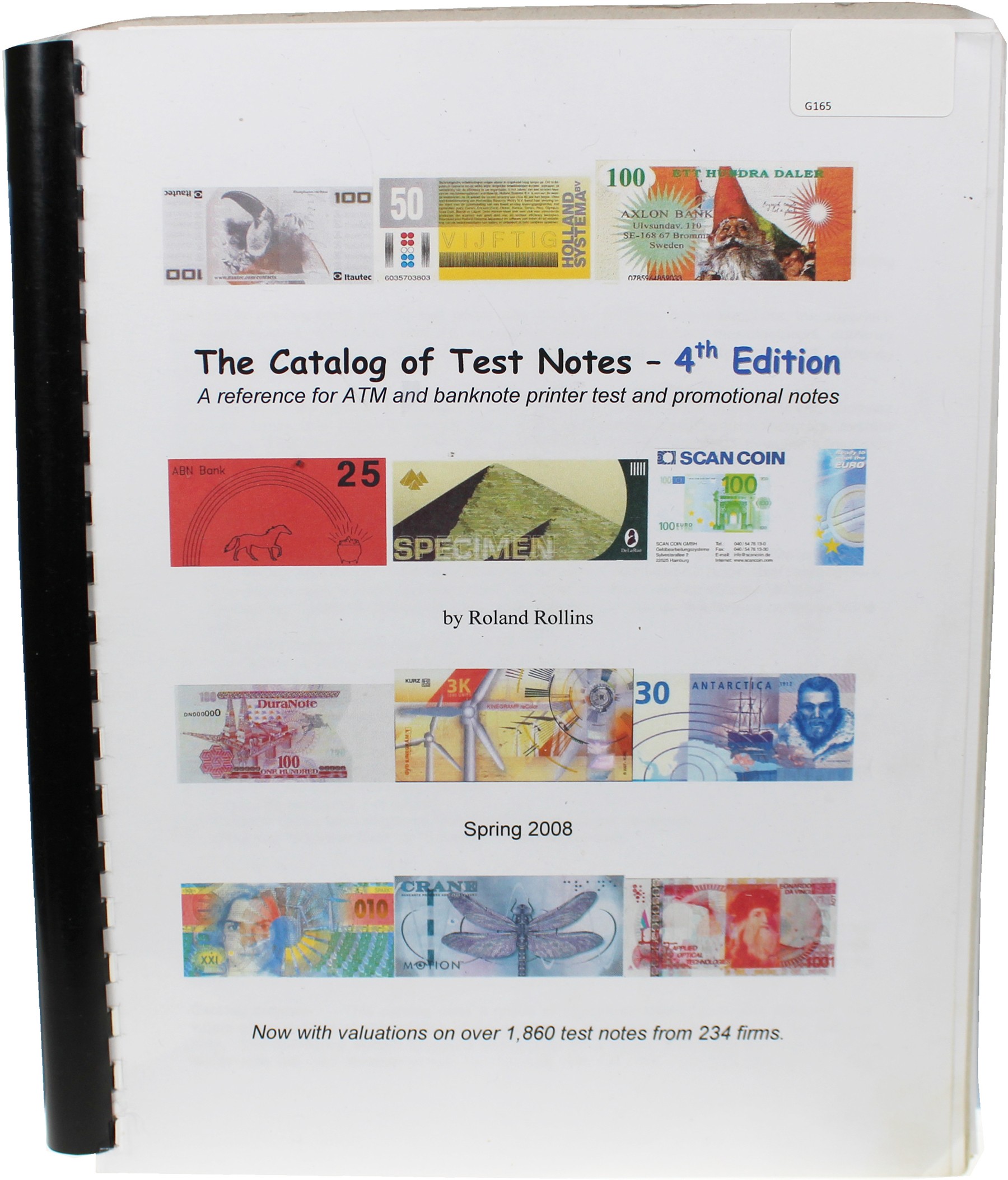 The Catalog of Test Notes, 4th edition. A reference for ATM and banknote printer test and promotional notes. Valuations on over 1.860 test notes from 234 firms all over the world. Spring 2008, by Roland Rollins. 166 pages!