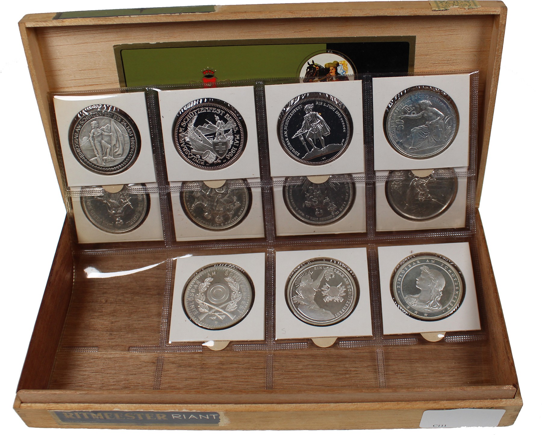 Ritmeester sigarenkist met Zwitserland 5 x originele ‘Schützentaler’ (1874, 1879, 1883, 1885 en 1984). Toegevoegd: 6 x replica’s.