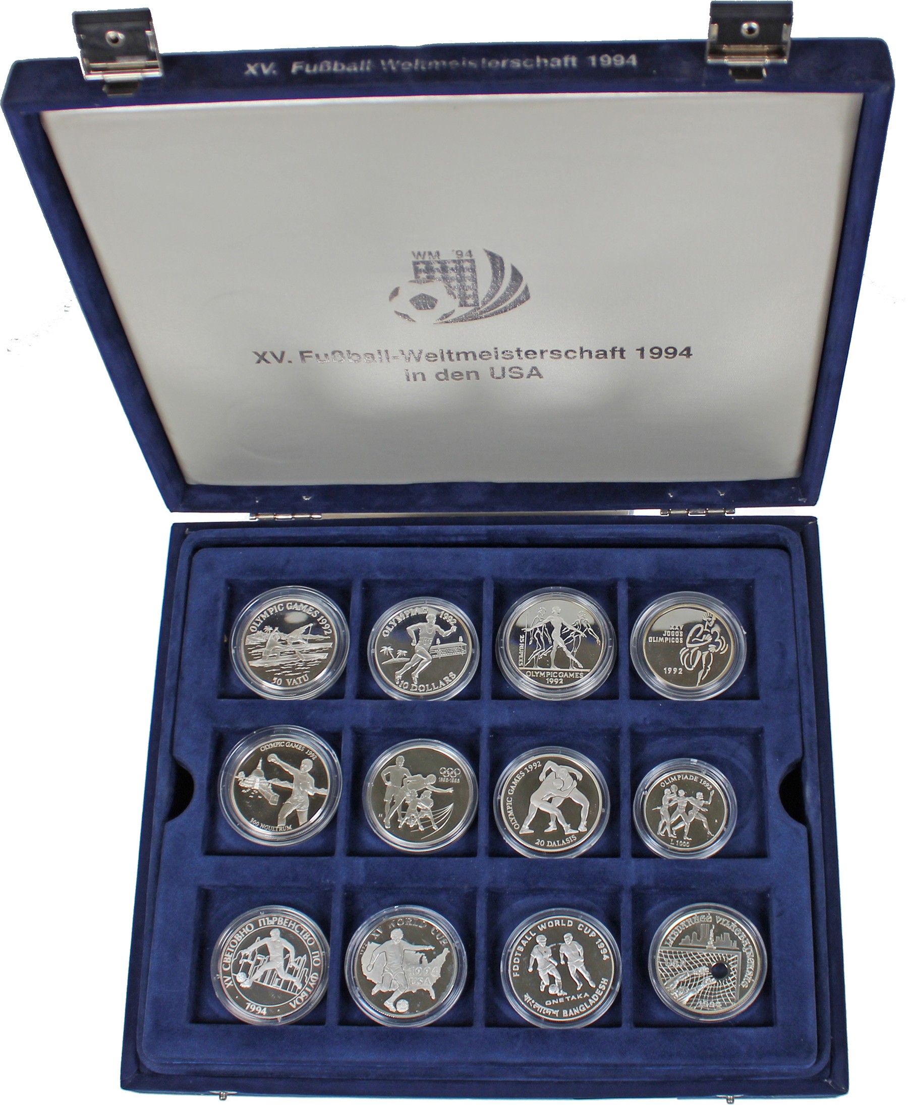 Blauwe cassette met 29 munten (28 x zilver). Voetbal WK 1994.