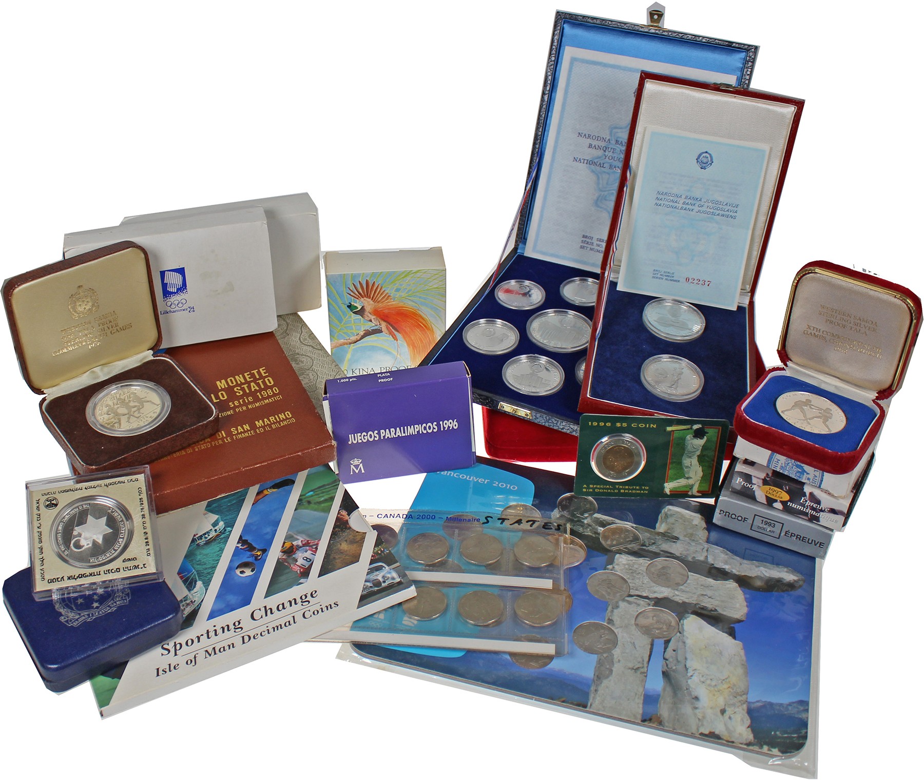 Rode doos met munten/setjes in originele verpakkingen met thema ‘sport’. Ook zilver.