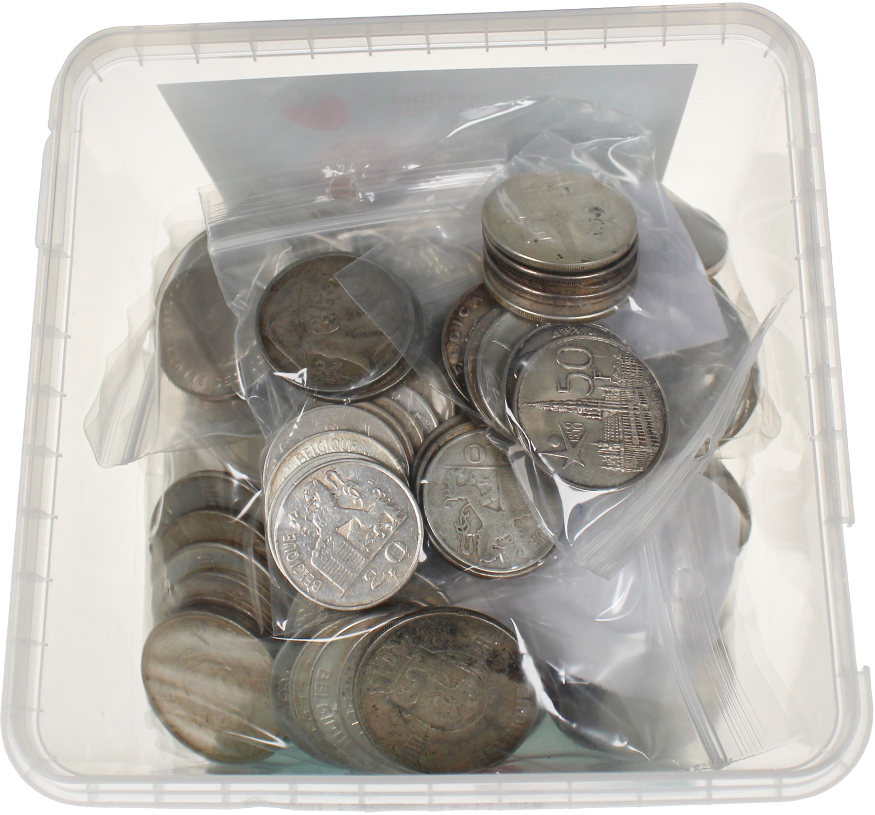Plastic bakje met ongesorteerde partij met Belgische zilveren munten. Ruim 1800 gram bruto AR. Diverse gehaltes.