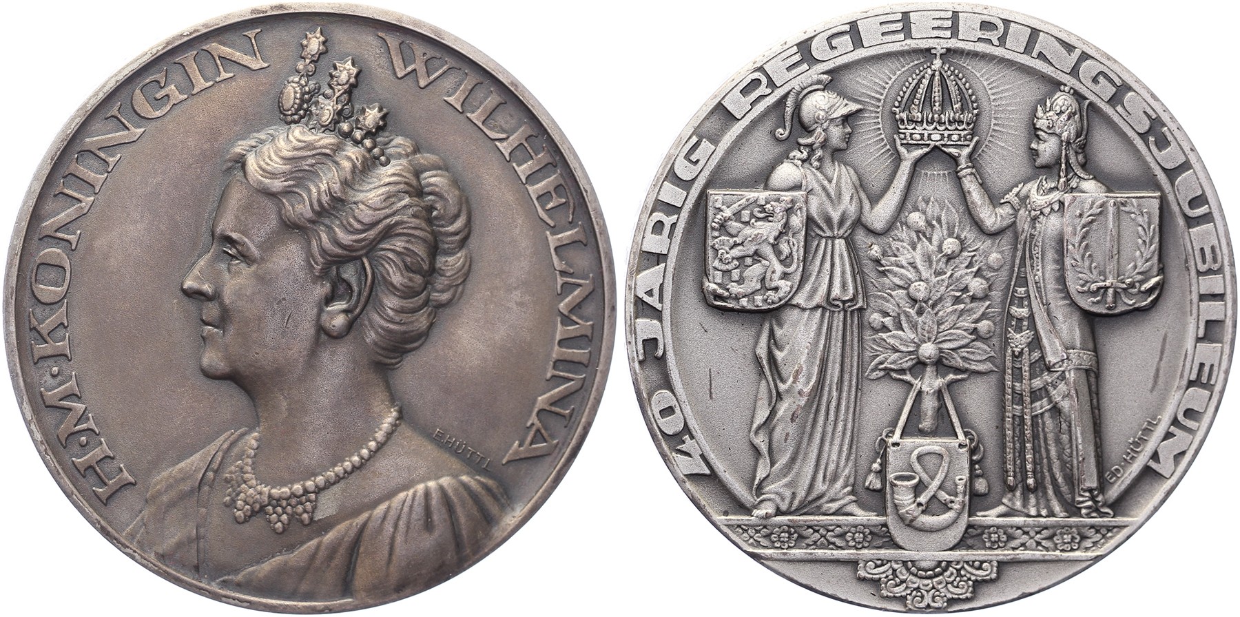 1938 40-jarig Regeringsjubileum Koningin Wilhelmina. Borstbeeld naar links met diadeem. / De Nederlandse en Indische maagd houden een kroon boven de oranjeboom. Randschrift: ORANJECOMITE BANDOENG HERINNERING OPTOCHT JUBILEUMFEESTEN 6-7-8 SEPTEMBER 1938.AR 60 [88,50 gram]. Bemolt 218. E. Hüttl. Zeldzaam. Prachtig. - Aangekocht bij Karel de Geus Muntveilingen, veiling 6, kavel 840.