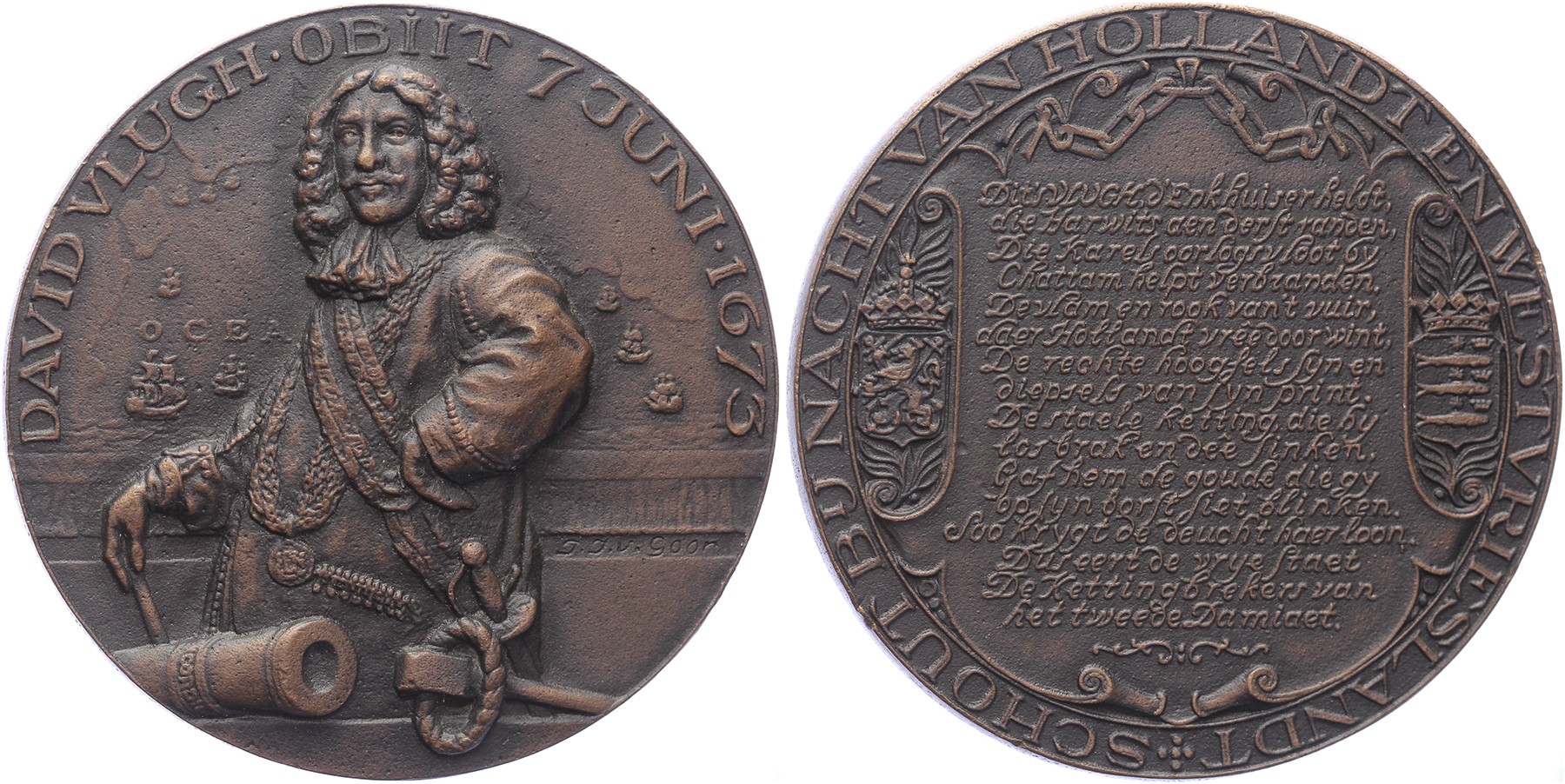 1943 David Vlugh. David Vlugh in admiraalsuniform met op achtergrond een wandkaart met schepen. / Zestienregelig opschrift met aan weerszijden wapens van de Admiraliteit en Enkhuizen. Omschrift: SCHOUT BIJ NACHT VAN HOLLANDT EN WESTVRIESLANDT.Æ 69 gegoten. KB V-1561. J.J. van Goor. Prachtig.