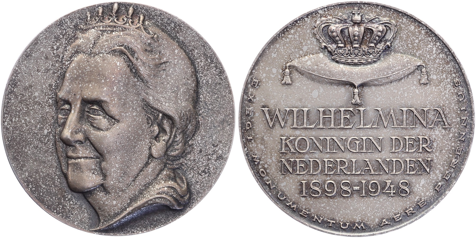 1948 Wilhelmina 50 jaar koningin. Hoofd driekwart naar links. / Koningskroon op kussen, daaronder vierregelige tekst. AR 50. KB V-1768. M. Kutterink. Prachtig. - Aangekocht bij Karel de Geus Muntveilingen, veiling 6, kavel 842.