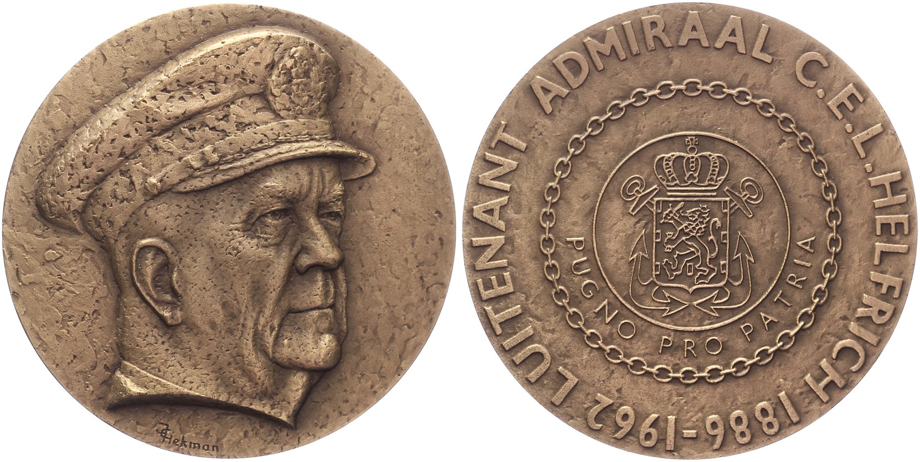 1962 Luitenant Admiraal C.E.L. Helfrich 1886-1962. Naar rechts gewend driekwart portret met admiraalspet. / Admiraliteitswapen omgeven door cirkel met daaromheen omschrift. Æ 50. KB VI-2790. J.C. Hekman. Prachtig.