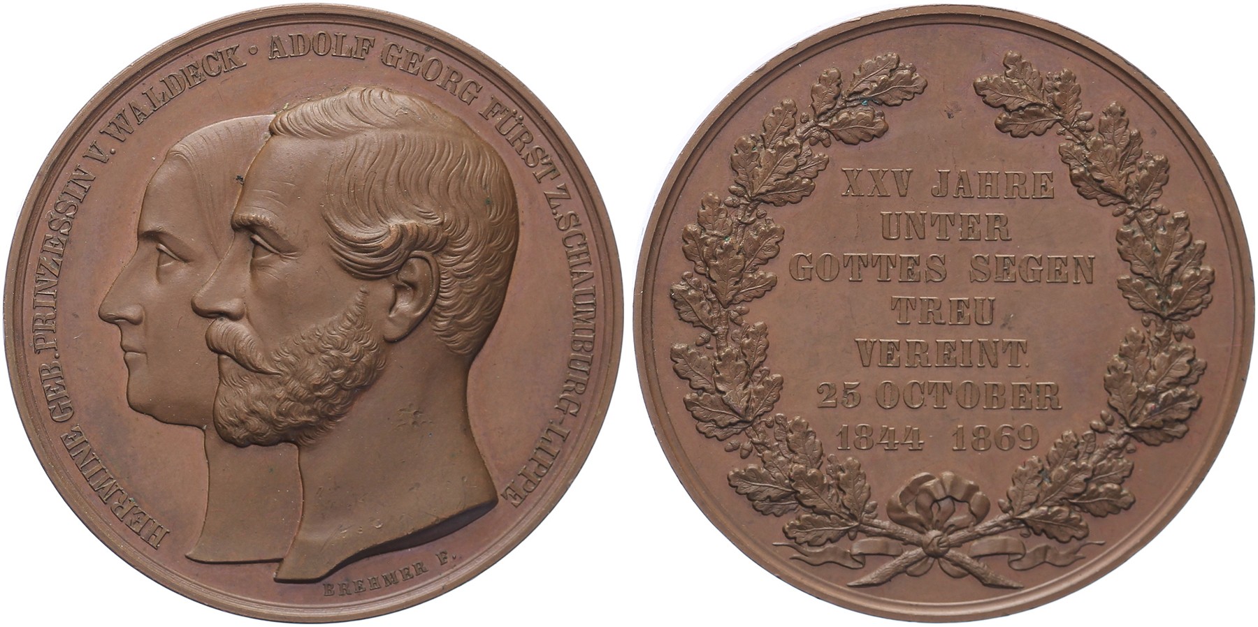 1869 Auf die Silberhochzeit Adolf Georg mit Hermine von Waldeck. Beider Köpfe nach links / Schrift in Kranz. Æ 46,5. Forrer I-271; Slg. Weweler 987. F. Brehmer. Kleine Randfehler. Vorzuglich. - Purchased from Jean Elsen, December 1996, auction 47, lot 1675.