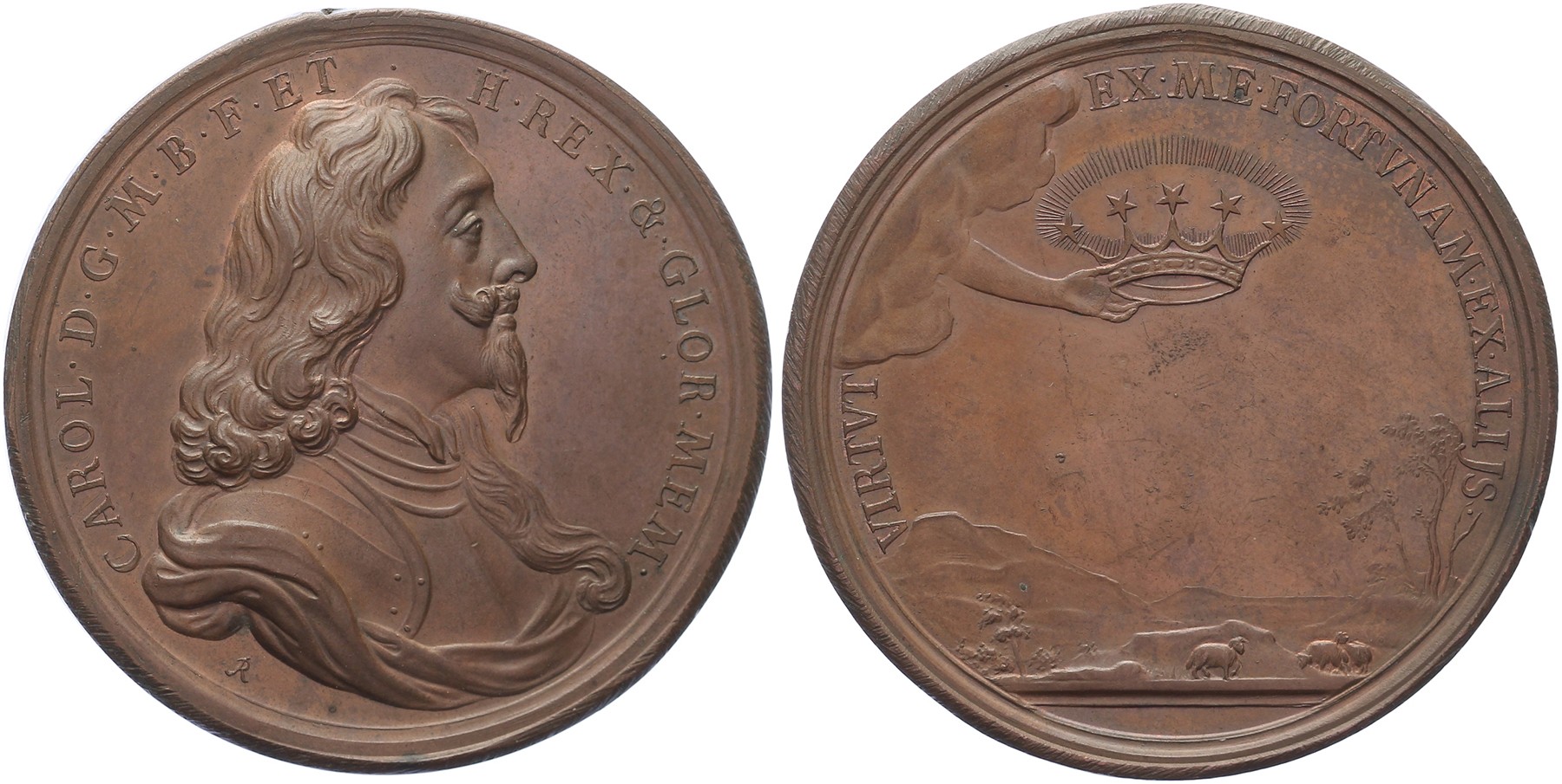 1649 Beheading of Charles I. Bust of Charles I right. Legend: CAROL. D.G. M. B. F. ET. H. REX. &. GLOR. MEM. / Hand of heaven holding a celestial crown; below a landscape with sheep feeding without a shepherd. Legend: VIRTVT. EX. ME. FORTVNAM. EX. ALIJS.Æ 51. Eimer 162a; vL II-333.2. John Roettiers. VF / EF - Purchased from Laurens Schulman BV, January 1994, auction 13, lot 1346.