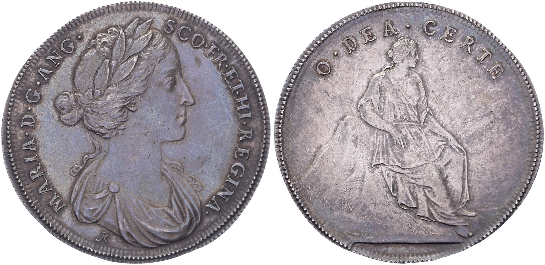 1685 Coronation of Mary. Bust right. / The queen seated upon a mound.AR 33,9 [14,88 g]. Eimer 274. J. Roettiers. VF.