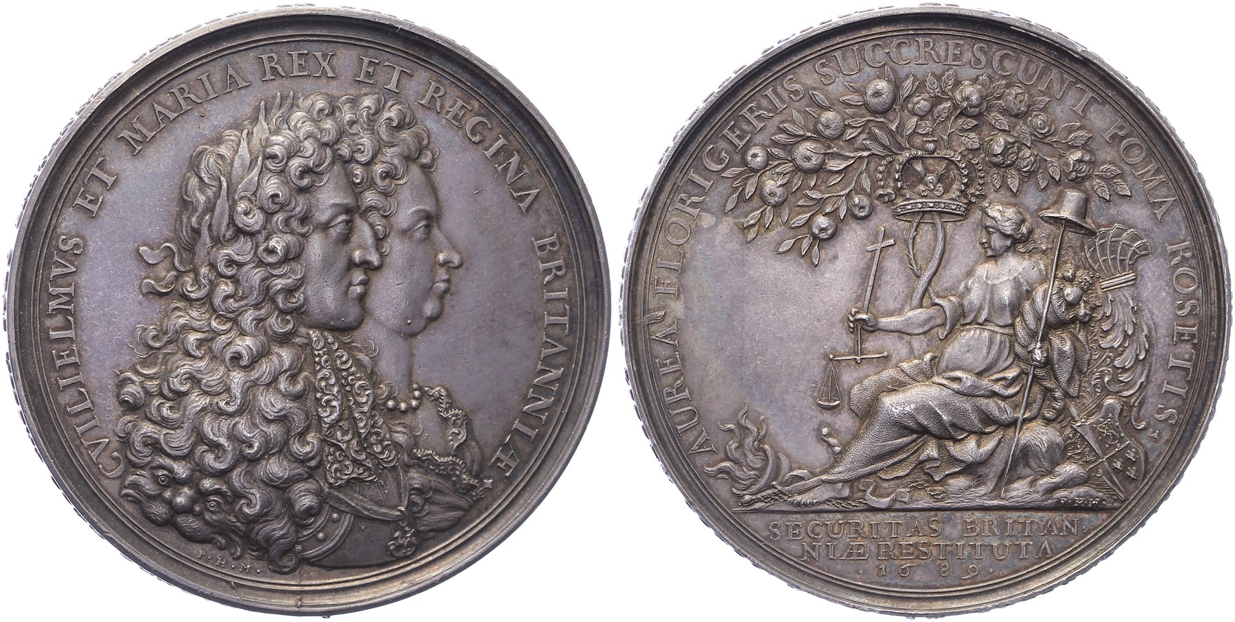 1689 William III & Mary and Security of Britain. Conjoined busts with long hair.: GVILIELMVS ET MARIA REX ET REGINA BRITANNIÆ. / Britannia seated on a rock underneath an orange tree, in exergue SECURITAS BRITAN- / NIÆ RESTITUTA / ·1689·. Lettered edge: * EXTERNO MALE PRESSA IUGO BRITANNIA PRIDEM, IN PRISCAS ITERUM RESPIRAT LIBERA LEGES· *· (FK). AR 55,5 [58,24 gram]. vL III-412.1; Eimer 313; Forster 657. P.H. Müller. Rare (RR). EF. - Purchased from Künker, October 2014, auction 254, lot 2213.