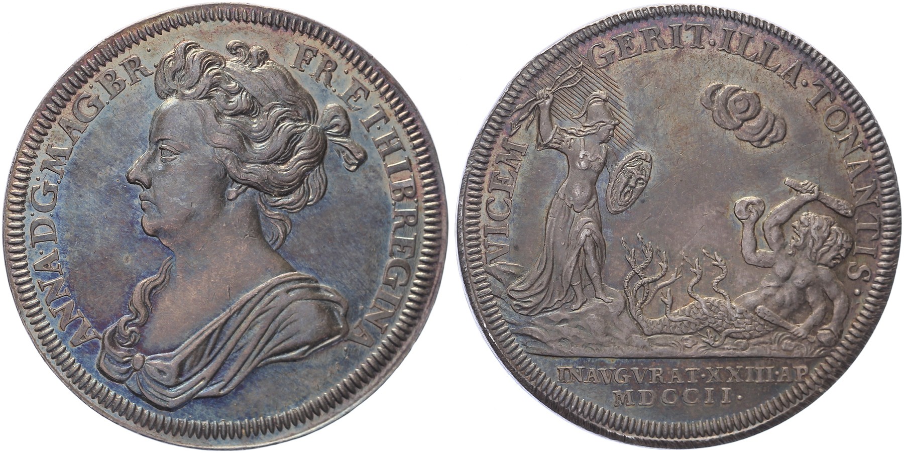 1702 Coronation of Queen Anne. Draped bust left. / Anna as Pallas, with shield and lightning, threatens two-headed monster with four arms.AR 35,5 [15,53 gram]. vL IV-291.1; Eimer 390. J. Croker. Almost EF. - Purchased from Laurens Schulman BV, April 1995, auction 14, lot 1771.