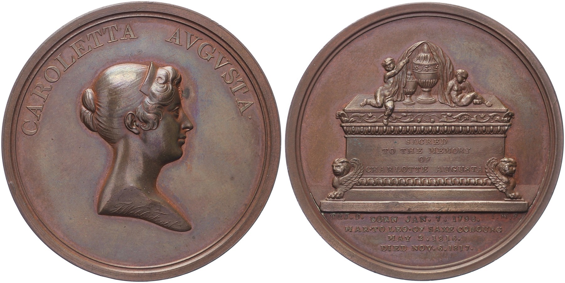 1817 Death of Charlotte Augusta, Princess of England. Bust of Charlotte Augusta right. Legend: CAROLETTA AVGVSTA. / Tomb with inscription. Æ 54. Eimer 1096. T. Webb & J. Marrian. EF.