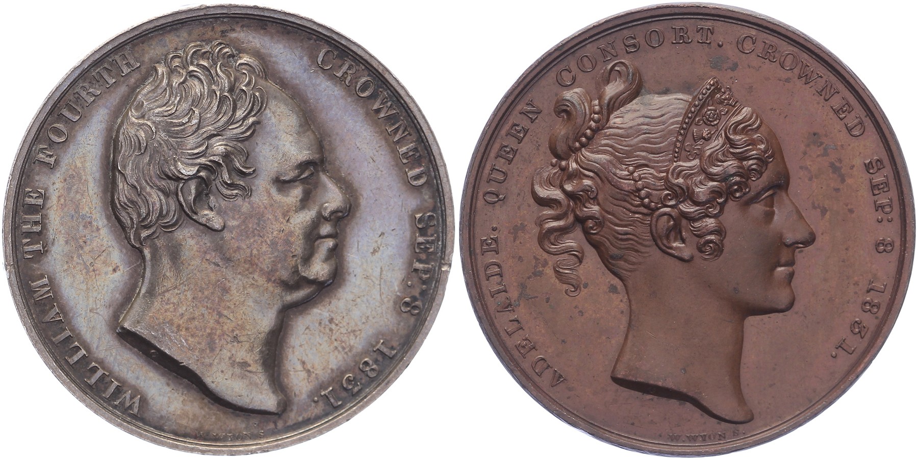 1831 Lot (2) Coronation of William IV. Bare head right. Legend: WILLIAM THE FOURTH CROWNED SEP:8 1831. / Diademed head of Queen Adelaide right. Legend: ADELAIDE. QUEEN CONSORT. CROWNED SEP: 6 1831. AR 33,4 Æ 33,7. Fearon 282.1; BHM 1475; Eimer 1251. W. Wyon. Edge imperfections on silver medal. VF.