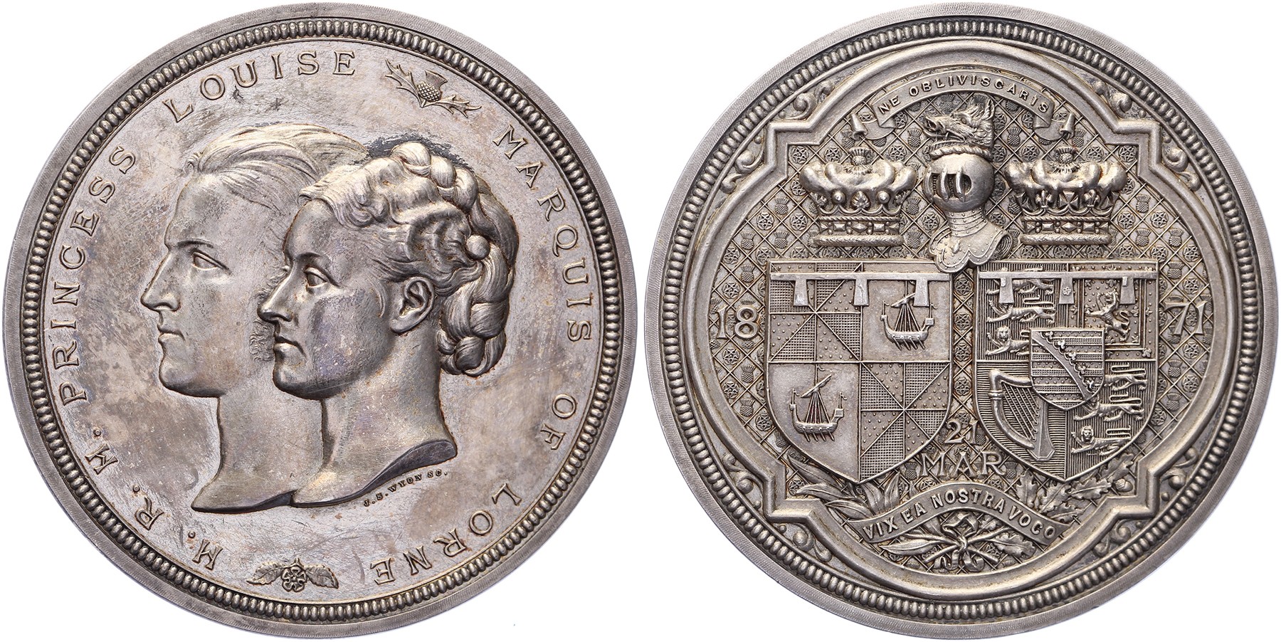 1871 Marriage of Princess Louise to the Marquis of Lorne. Conjoined heads left. Legend: H.R.H. princess louise marquis of lorne. / Heraldic shields dividing 1871 within ornamental quatrefoil. AR 64 [159,34 gram]. BHM 2916; Eimer 1613. J.S. Wyon. EF. - Purchased from Jean Elsen, December 1997 auction 52, lot 1020.