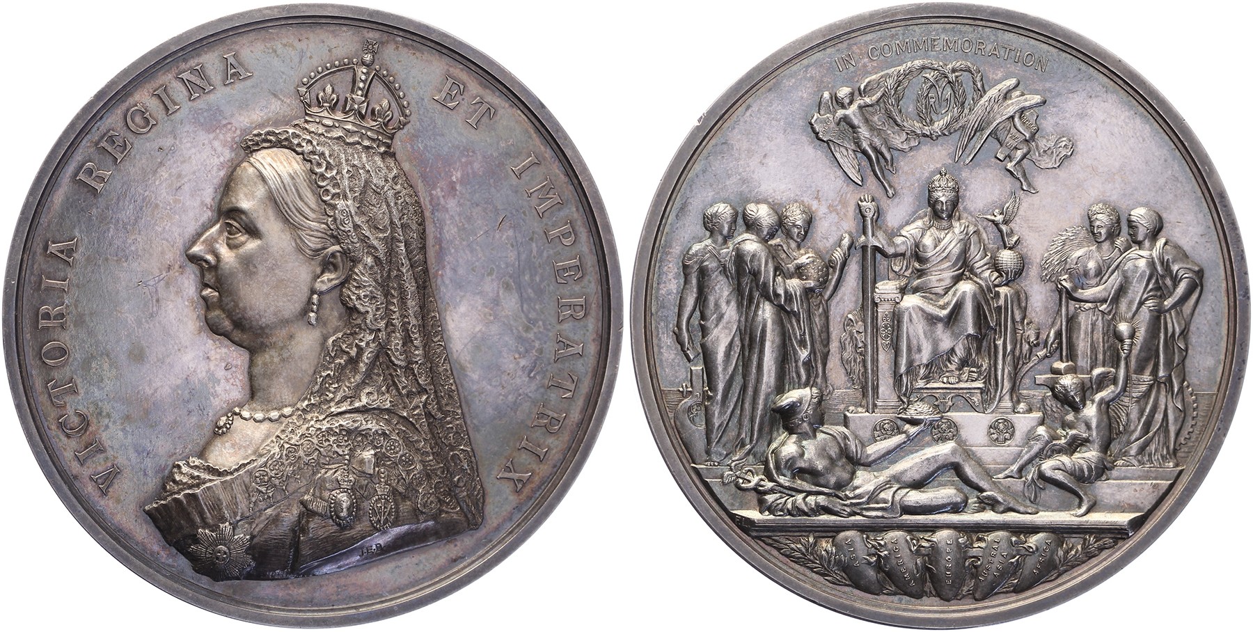 1887 Golden jubilee Queen Victoria. Bust Victoria left. / Enthroned figure of Empire between Science, Letters, Art, Industry and Agriculture. AR 77 [219 g]. BHM 3219; Eimer 1733b. J.E. Boehm & F. Leighton. Minor edge nick rev. Lovely toning. In original brown case. Unc.