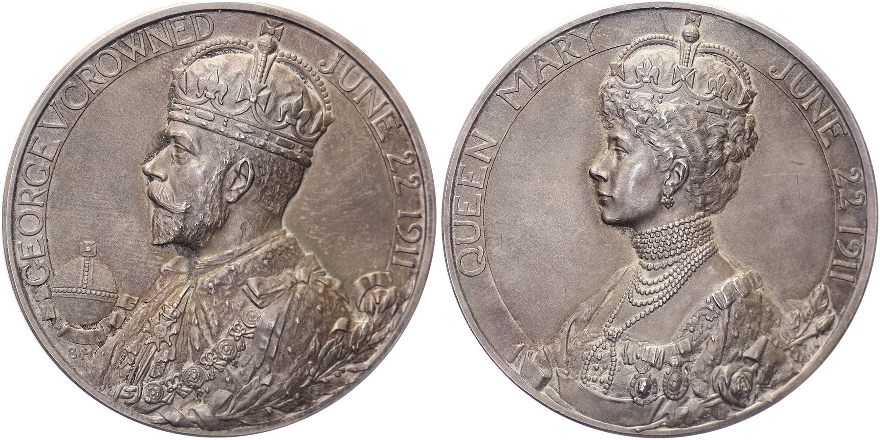1911 Coronation of King George V and Queen Mary. Crowned bust of King George V. / Crowned bust of Queen Mary. AR 51 [88,90 gram]. Eimer 1922a. B. Mackennal. EF.