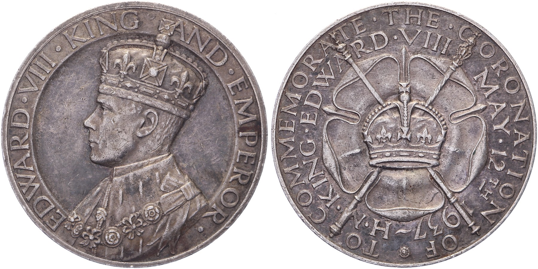 1936 Coronation of Edward VIII. Crowned and draped bust Edward left. / Crown on crossed sceptres on a Tudor Rose. AR 35 [17,58 g]. By John Pinches Ltd. BHM 4291. VF.