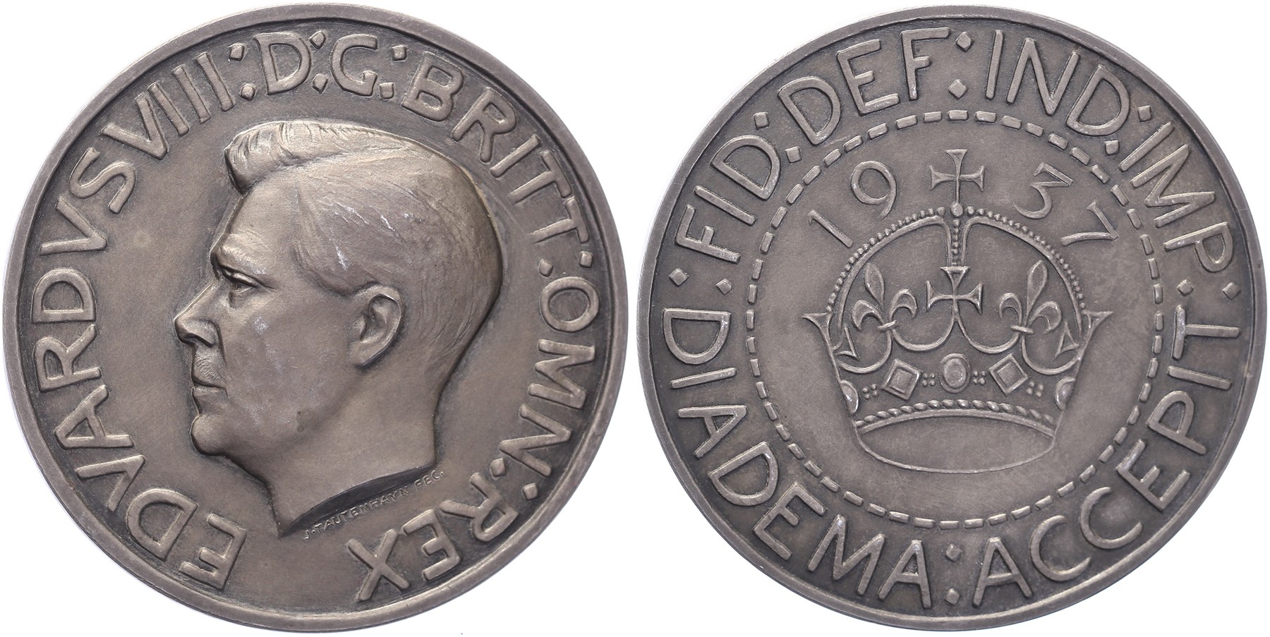 1937 Proposed Coronation of Edward VIII. Bust left. Legend: EDWARDVS VIII: D:G: BRITT: OMN: REX. / Date over crown. Legend: DIADEMA. ACCEPIT. FID. DEF. IND. IMP. AR 60 [97,98 gram]. BHM 4297; Eimer 2043. By J. Tautenhayn Jr. EF. - Purchased from Munthandel Verschoor, October 2002.