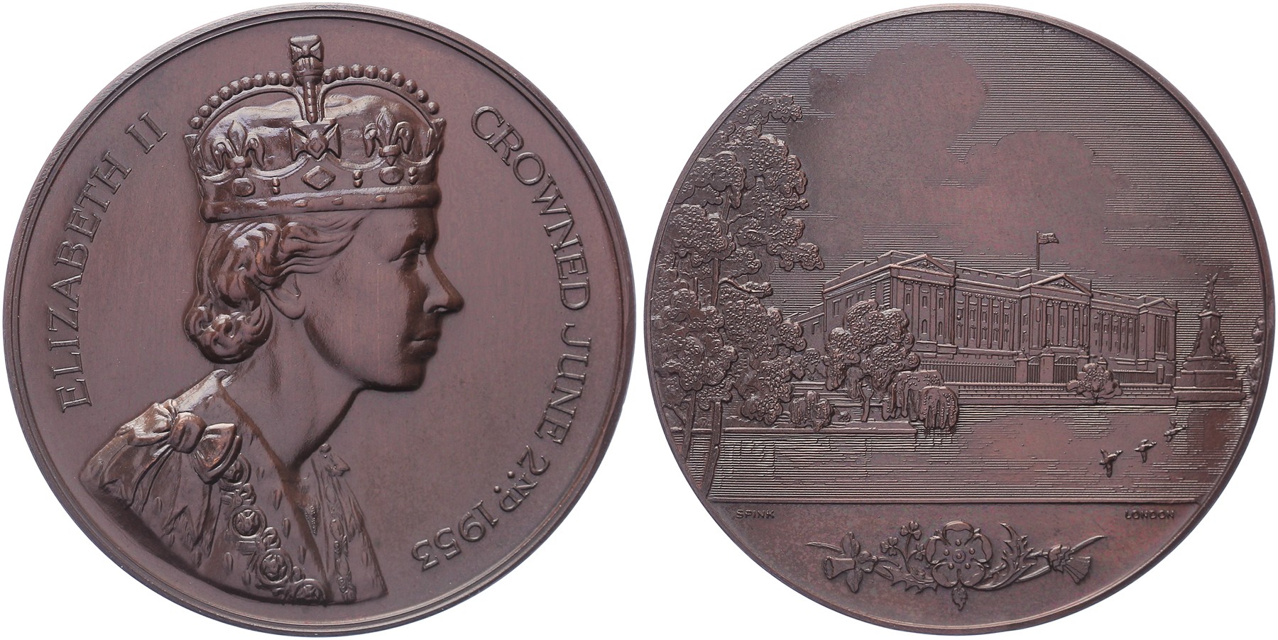 1953 Coronation of Elizabeth II. Crowned head to right. / Buckingham Palace. Æ 57. Eimer 2086a. Spink & Son. EF / UNC.