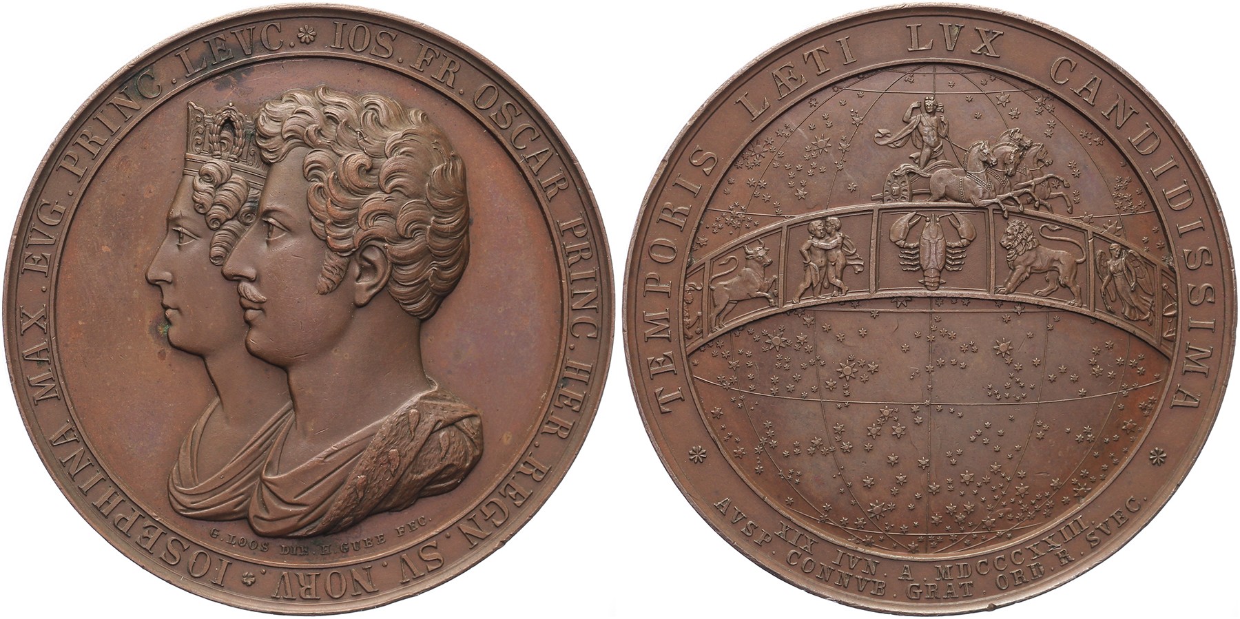 1823 Wedding of Oscar I. Busts of Prince Oscar & Princess Josephine left. / Starry sky with Zodiac. Æ 60. G. Loos. VF.
