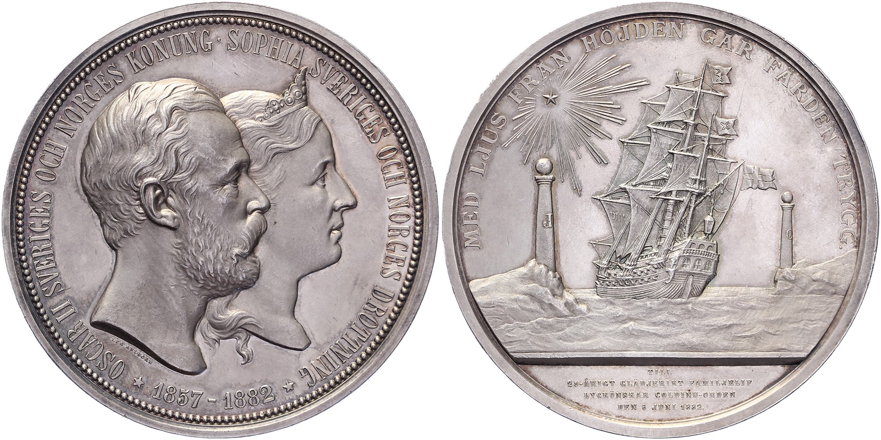 1882 Silver Wedding of the Swedish-Norwegian King Oskar II and his wife Sophia on June 6th 1882. Both busts side by side right. / Sailing ship at sea with pillars on rocks on the side.AR 69 [166,5 gram]. Wurzbach Hyckert 13S. Lea Ahlborn. Nice toning. EF. - Purchased from Künker, October 2008, auction 143, lot 1327.