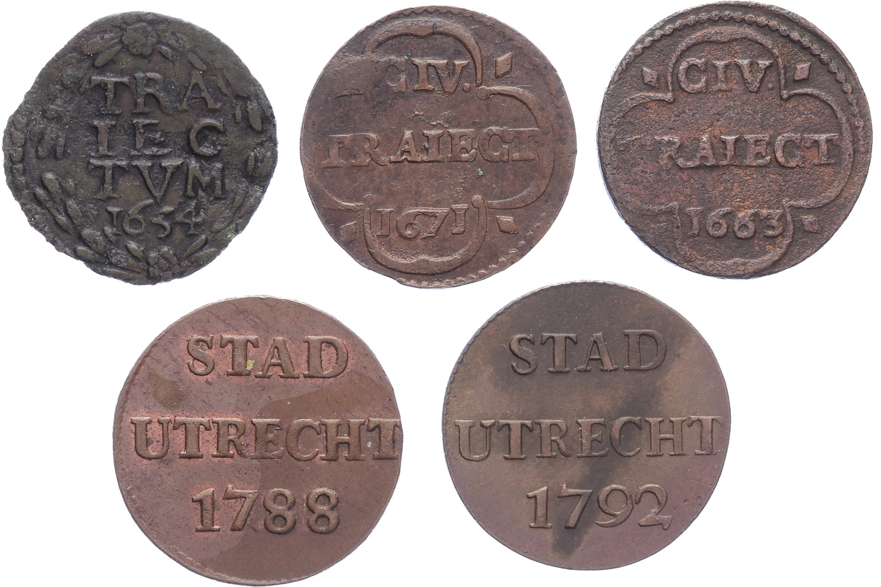Lot (5) Duiten 1634, 1663, 1671, 1788 en 1792. Deels originele muntkleur. Zeer fraai en beter.