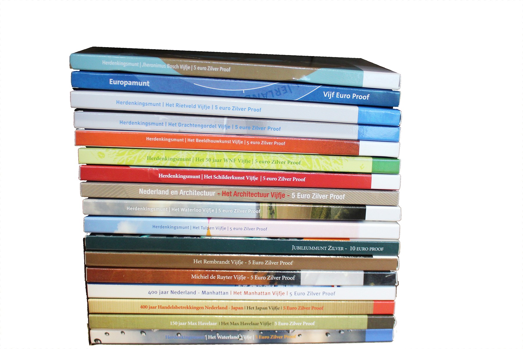 Doos met 16 stuks 5 euro herdenkingsmunten, alle verschillend. 1 x 10 euro 2005 zilver regeringsjubileum Beatrix. Alle proof.