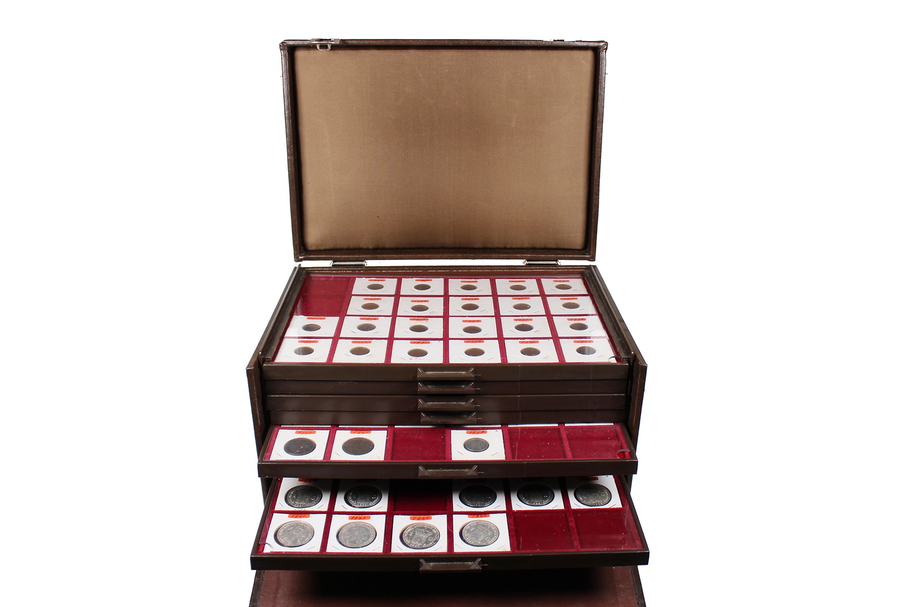 Bruin imitatielederen koffertje met tien laden gevuld met eenvoudig koninkrijk; van ½ cent t/m rijksdaalder. Tevens iets provinciaal. Totaal 208 stuks.