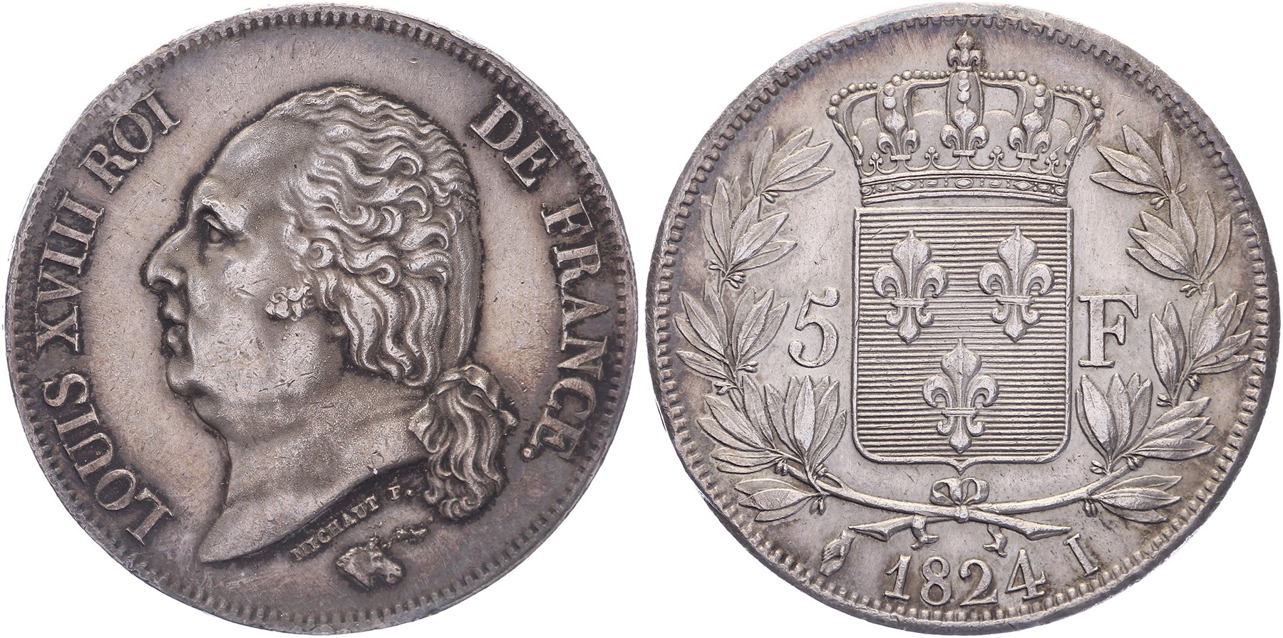 5 Francs 1824I (Limoges). Gad. 614; KM 711.6. Nice VF.