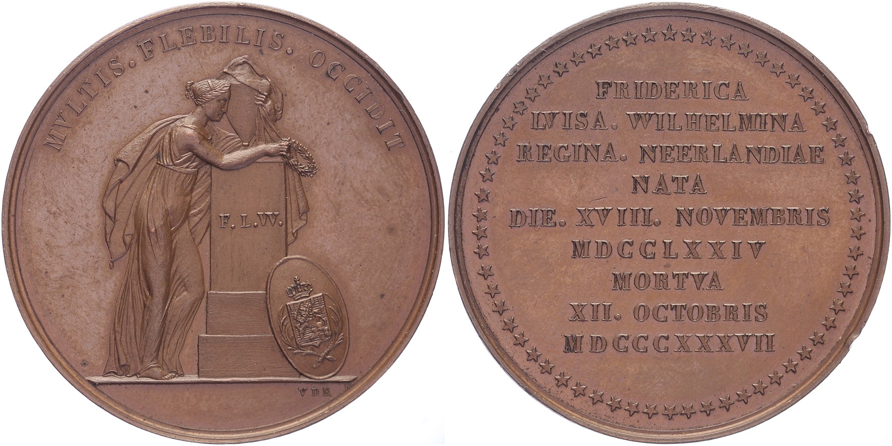 1837 Overlijden Frederika Louisa Wilhelmina, vrouw koning Willem I. Treurende Nederlandse maagd met lijkbus en krans. / Negenregelig opschrift. Æ 41. Dirks 531. D. van der Kellen jr. Prachtig.