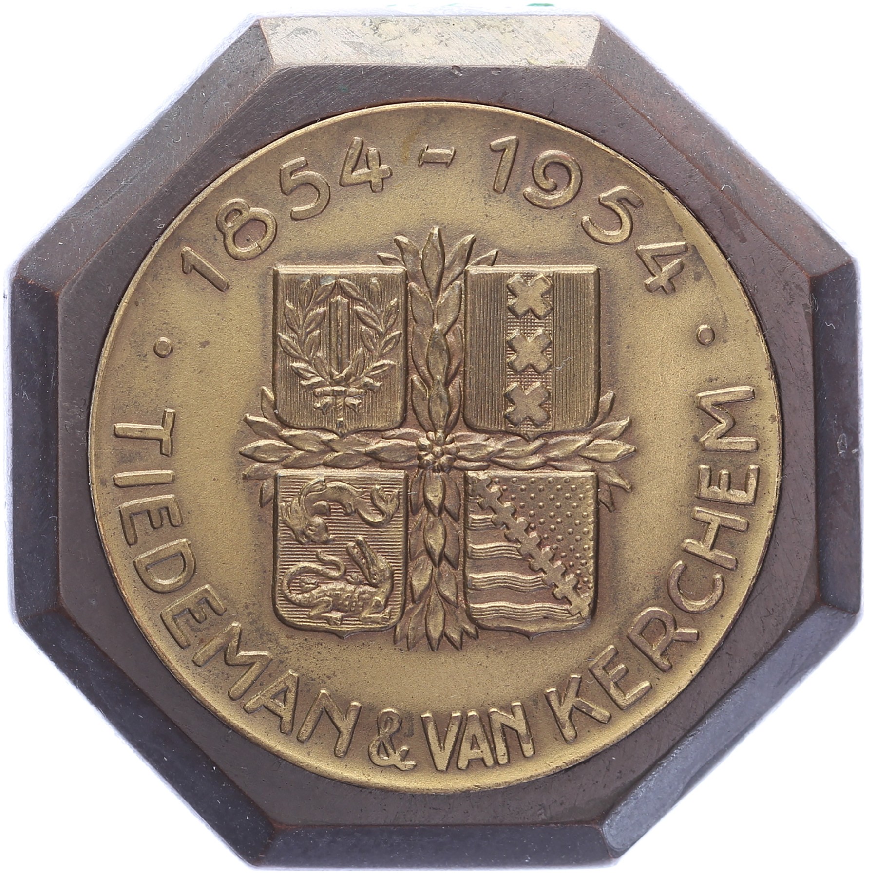 1954 Batavia/Jakarta. Eeuwfeest Tiedeman & van Kerchem. Vier wapenschilden. / glad.Æ 40, gevat in 8-hoekige presse-papier. Prachtig.