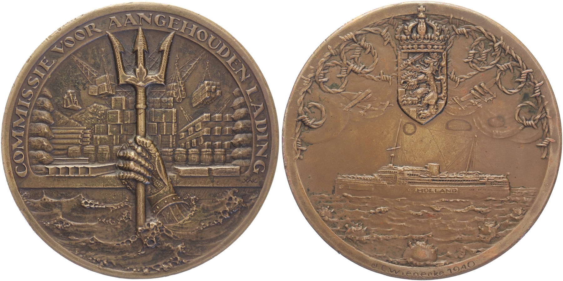 1940 Opheffing Commissie voor aangehouden Lading. Gepantserde vuist met drietand van Neptunus. / Koopvaardijschip onder gekroond Nederlands wapenschild..Æ 66,2 mm. CJCW 436. Zeldzaam. Wat vlekkerig, maar toch nog prachtig.N.B. Deze penning is aangeboden door de voorzitter van de commissie, G.H. Crone, aan de commissieleden en medewerkers.