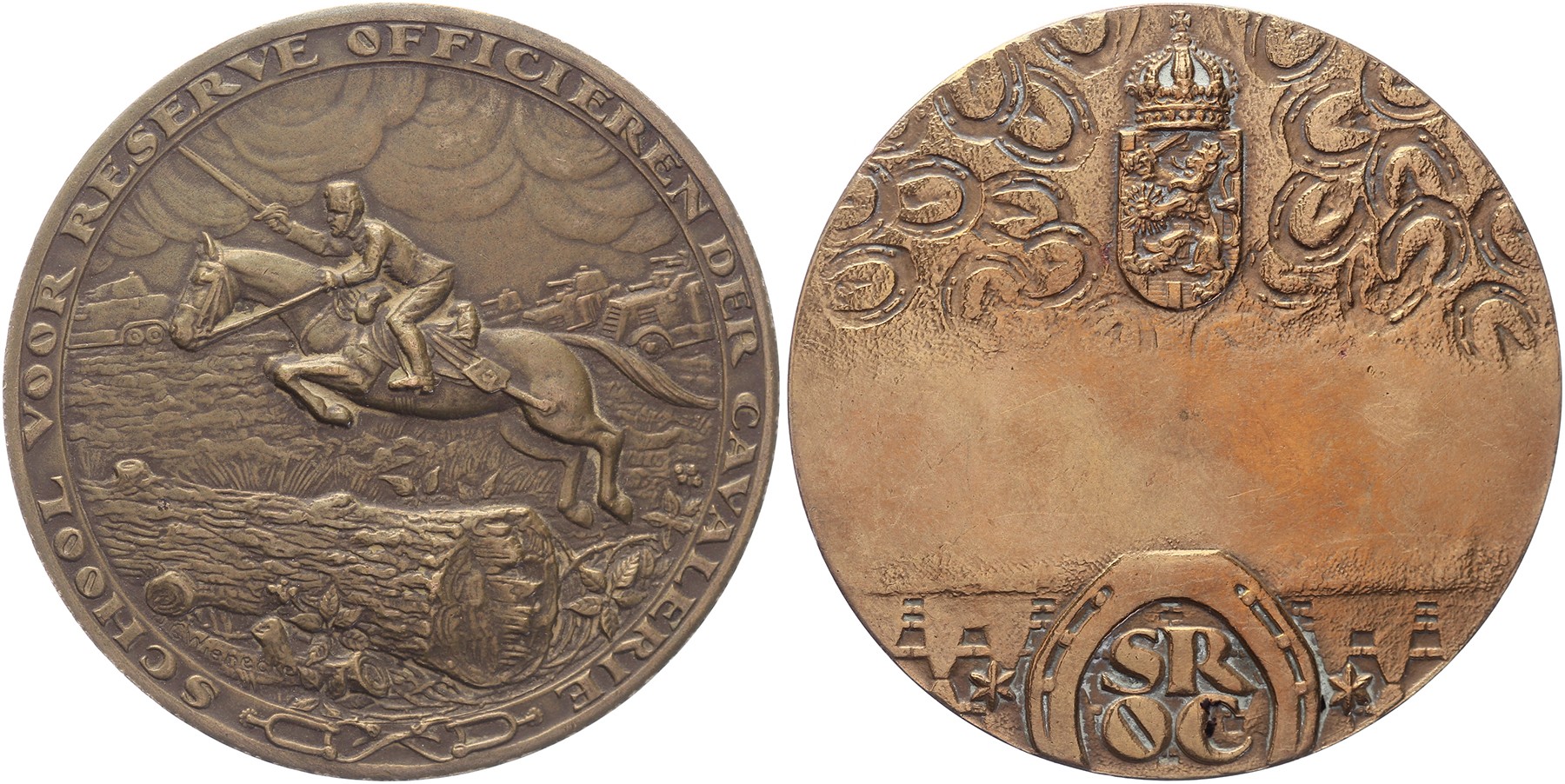 (1940) Prijspenning School voor Reserve Officieren der Cavalerie (SROC). Paard met cavalerist springt over liggende boomstam. / Inscriptieruimte binnen met hoefafdrukken gevuld vlak.Æ 60. Bax 229a; CJCW 435. Keerzijde gepoetst, voorzijde niet. Prachtig.