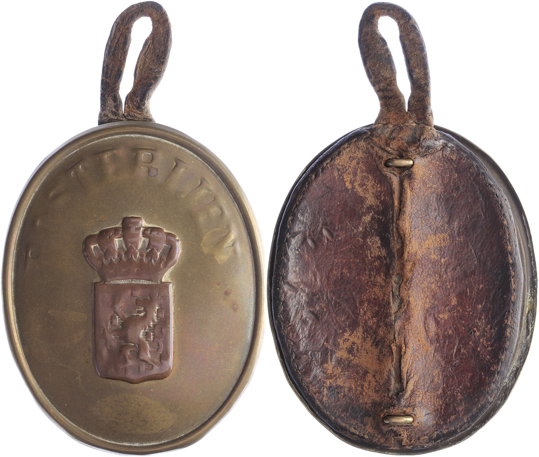 z.j. (19e / 20e eeuw). Identificatiepenning Nederlandsche Posterijen. Messing ovaal 85 x 70. Met nog intact leren lusje. Fraai.